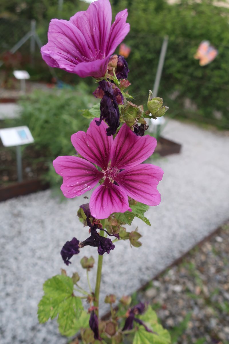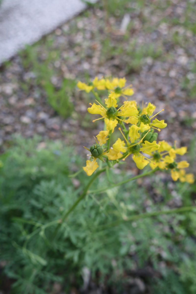 Die Weinraute gehört zu einer kleinen Familie, den Rautengewächsen. Die Pflanze ist mehrjährig und wird 30-60 cm hoch und im Sommer erscheinen schöne gelbe Blüten. Interessanterweise hat die mittlere Blüte 5 Blütenblätter, die andern aber haben nur 4. Die Heimat der Pflanze ist der östliche Mittelmeerraum. Aber sie ist inzwischen vielerorts verwildert. Der bittere Geschmack der Blätter gilt als appetitanregendes Gewürz. Aus den Blättern und Blüten stellt man Tee her, dem eine Heilwirkung zugeschrieben wird.