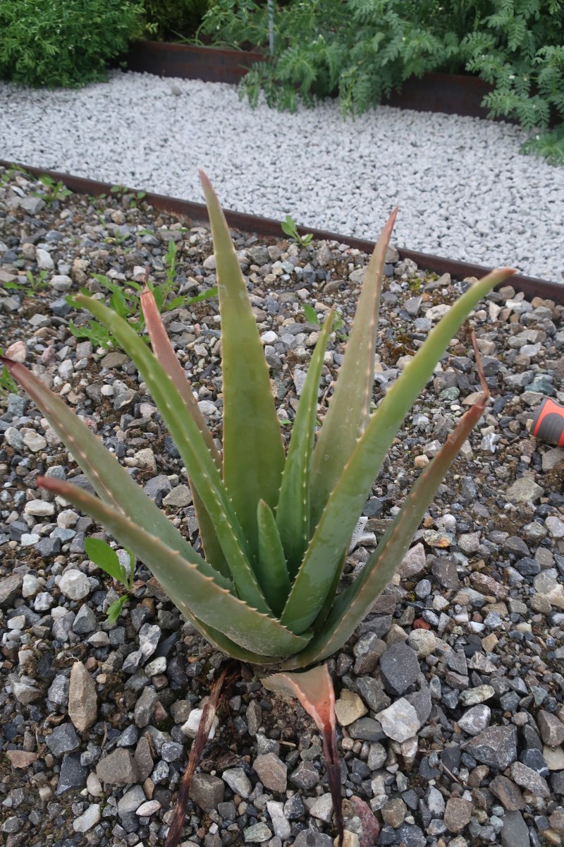 Die Aloe gehört zur Familie der Affodillgewächse, die den Liliengewächsen nahesteht. Die Pflanze bildet eine Rosette aus dicken saftreichen Blättern, die Wasser speichern und grosse Trockenheit überdauern können. Nach etlichen Jahren bildet sie einen grossen Blütenstand und stirbt dann ab. Bei uns ist die Pflanze nicht winterhart. Die Heimat ist die arabische Halbinsel. Heute ist Aloe vera sehr in Mode gekommen. Sie soll ein Wundermittel für die Haut sein. Die Salben werden auch bei Sonnenbrand und Hautausschlägen eingesetzt. Wenn man die Blätter an der Basis abbricht, fliesst ein Saft aus. Dieser enthält aber noch einen Giftstoff, sodass er sehr sorgfältig weiterverarbeitet werden muss.