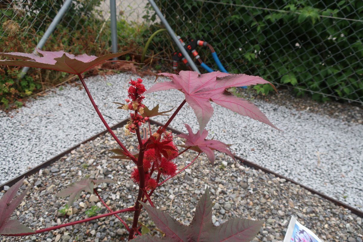 Rizinus gehört zu den Wolfsmilchgewächsen und ist wie die meisten von ihnen giftig. Rizinusstauden können im Mittelmeergebiet innert 3 Monaten bis 6 m hoch werden. Dort sind sie mehrjährig und erreichen nach mehreren Jahren manchmal über 10 m Höhe. Bei uns sterben sie im Winter ab, weil sie nicht frosthart sind. Entsprechend bleiben die Pflanzen bedeutend kleiner. Bei uns blühen die Rizinuspflanzen im Spätsommer oder Herbst. Im Blütenstand sind die weiblichen Blüten oben und die männlichen unten. Aus den weiblichen Blüten entwickeln sich stachlige Früchte. Das Rizinusöl wird aus den grossen Samen gewonnen uns ist ein starkes Abführmittel. Das Gift der Samen (Rizin) bleibt im Pressrückstand.